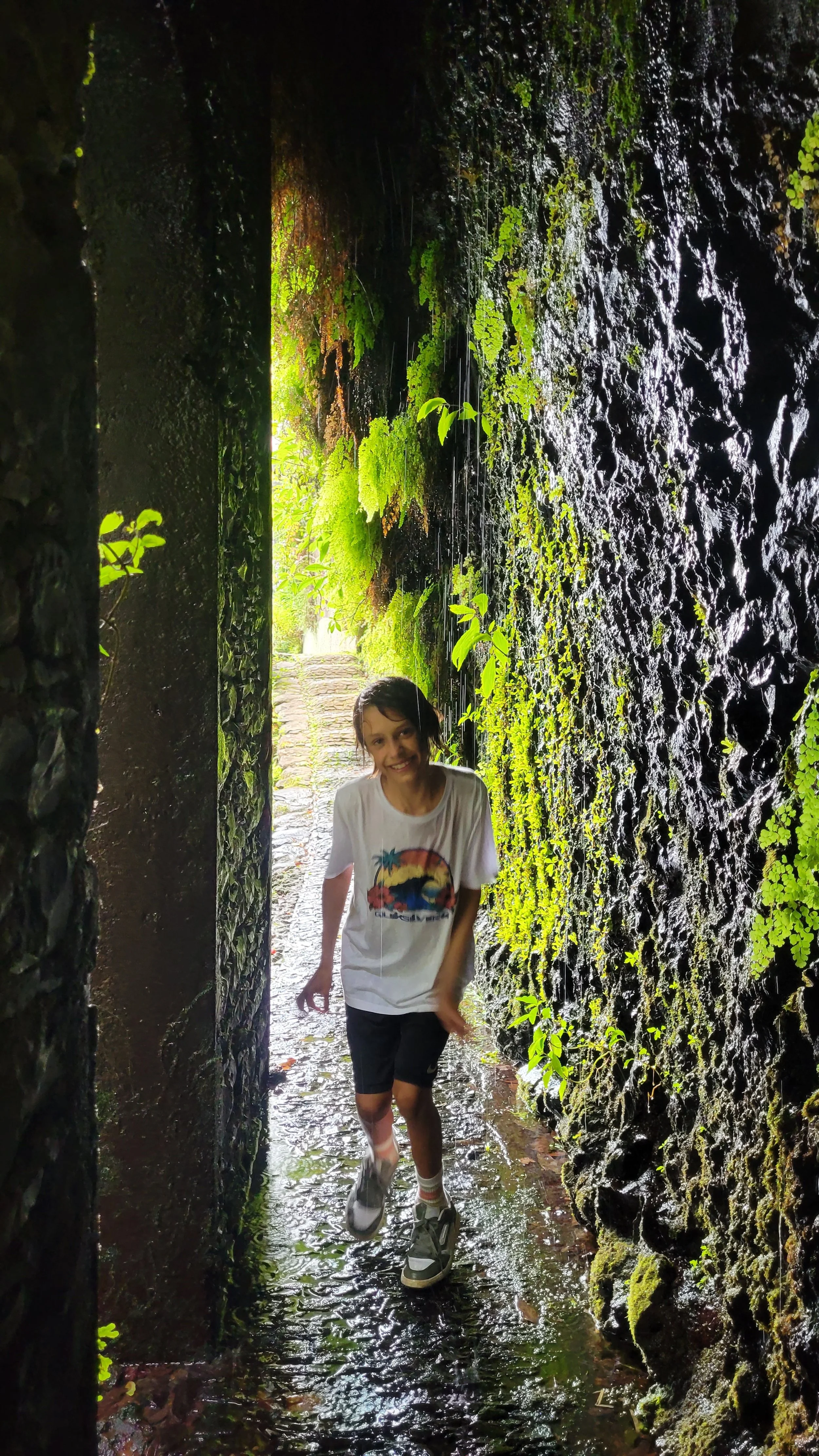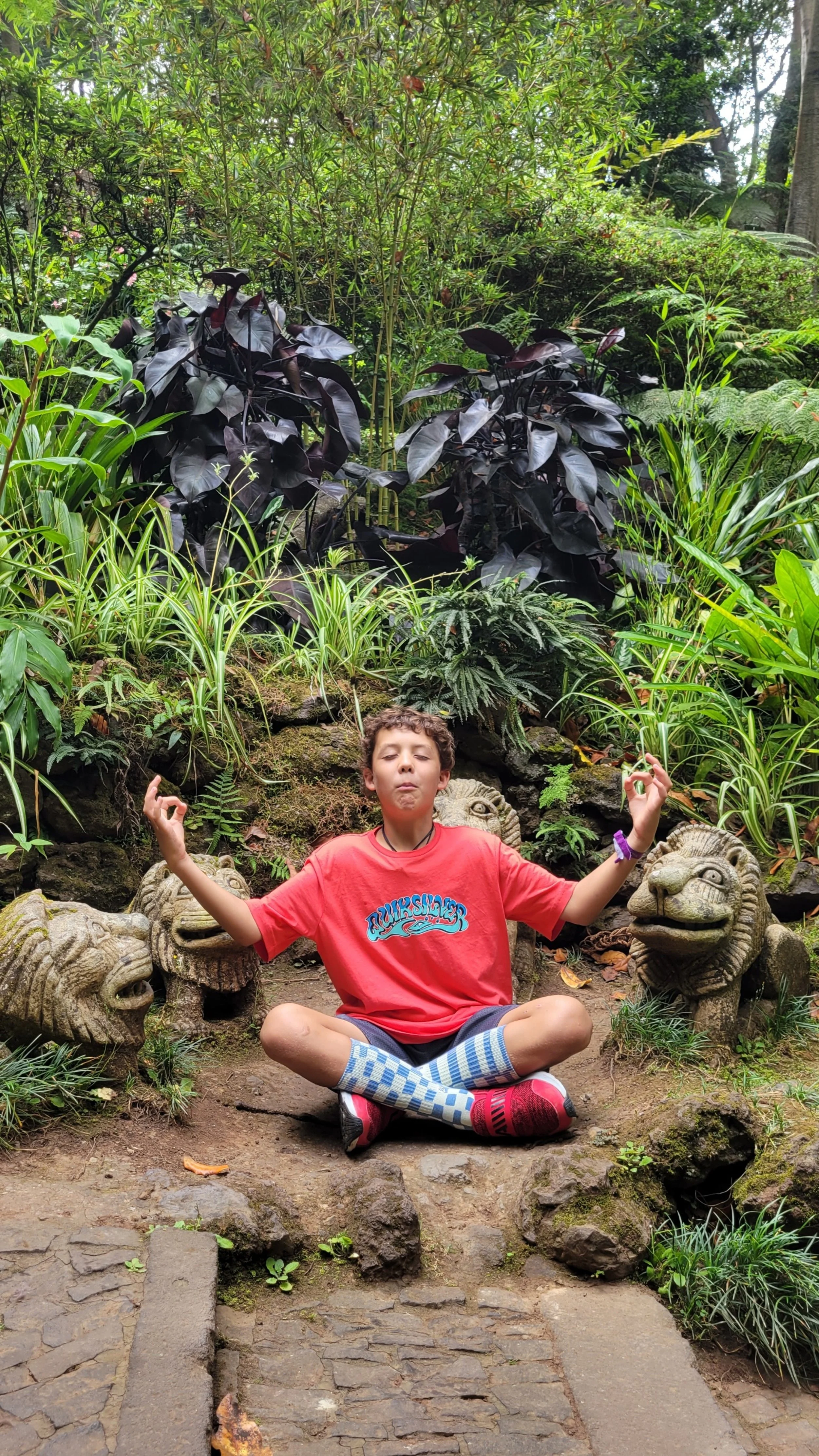 One of our favorite spots in the gardens was a dreamy water feature with mossy, green walls and a cascading waterfall that felt almost enchanted. Two paths led through it: one dry, one very much not. And, unsurprisingly, three of us immediately chose the wet path. The boys ran straight through the waterfall, laughing the whole way, and emerged on the other side absolutely soaked—shoes, clothes, hair, everything. It was spontaneous, ridiculous, and perfect… one of those memories that ends up meaning more than any photo ever could.