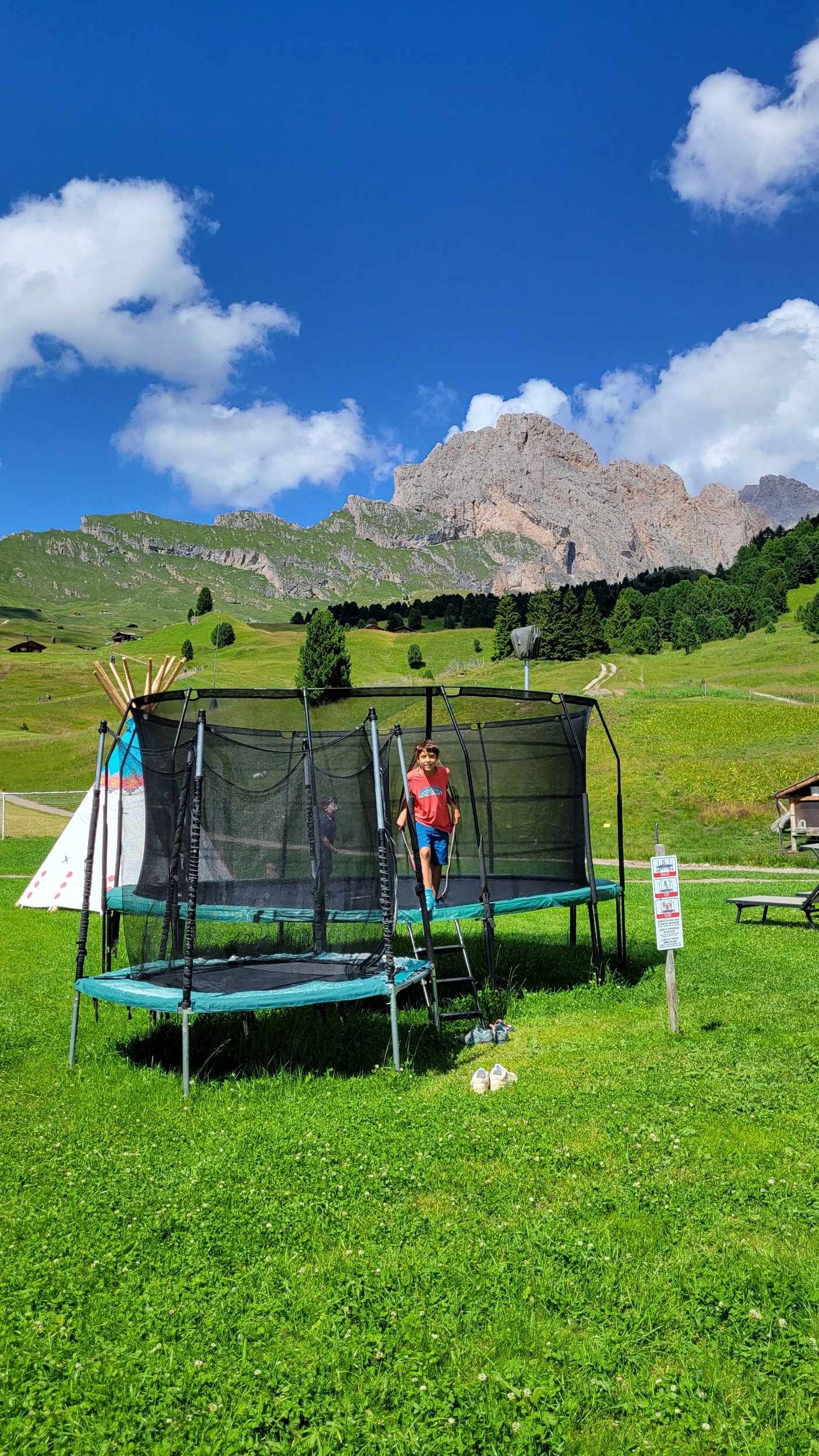 As we descended, we discovered something magical about this part of Italy: the mountain is scattered with family-owned restaurants that are so much more than just places to eat. Each one felt like its own little alpine playground. Trampolines. Parks. Streams to dip tired feet into. Ziplines. Swings. Lounge chairs. Games. It was heaven—for kids and adults alike.
