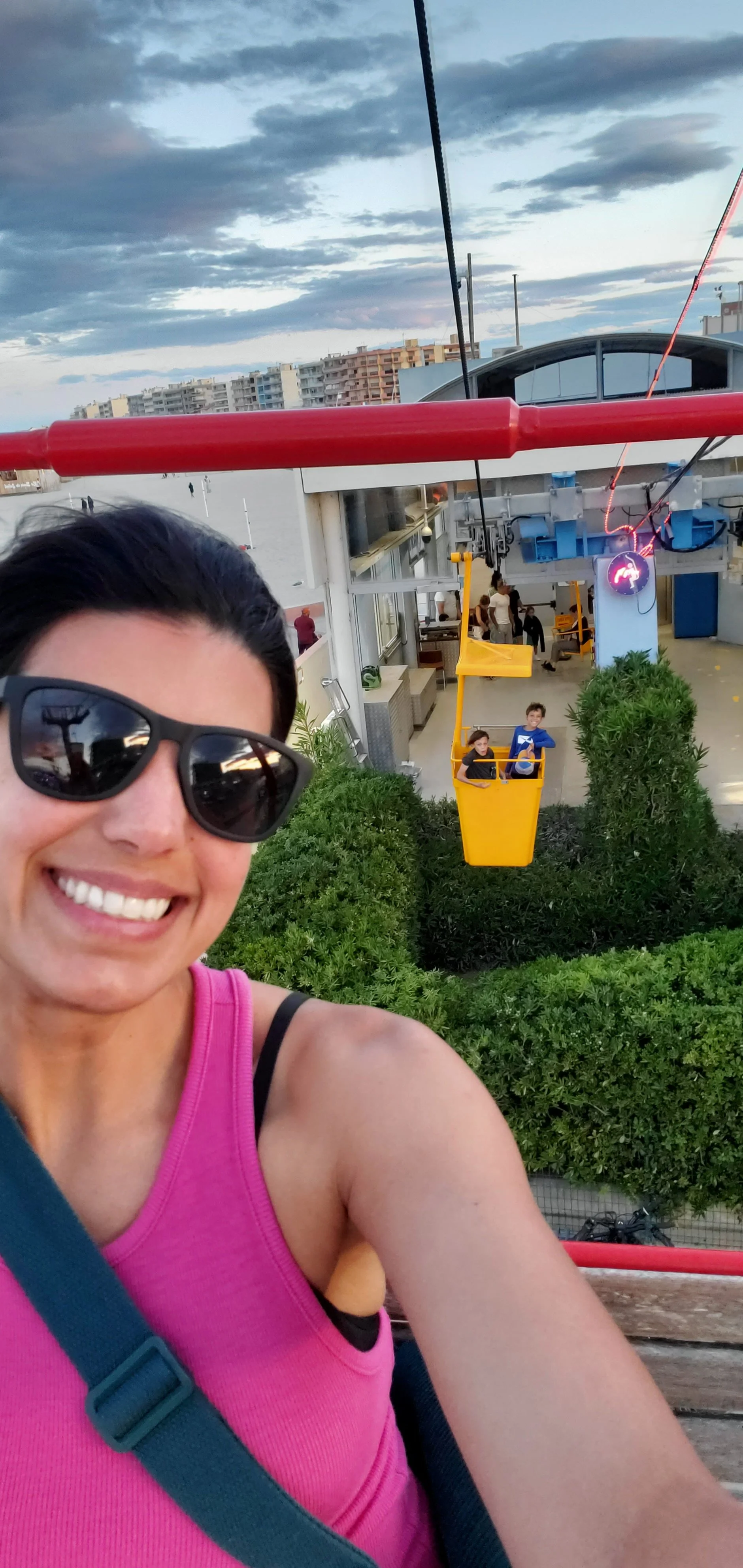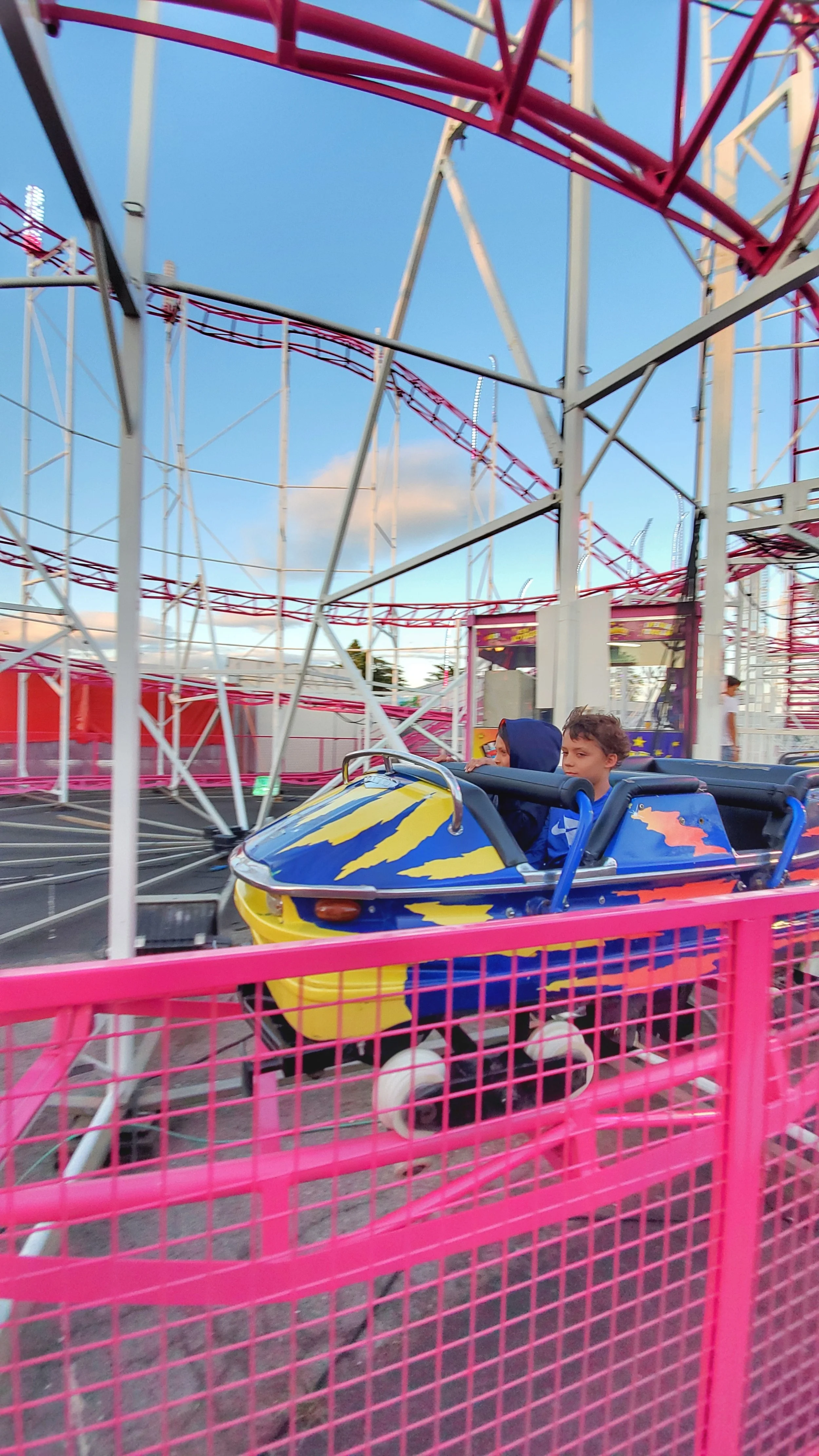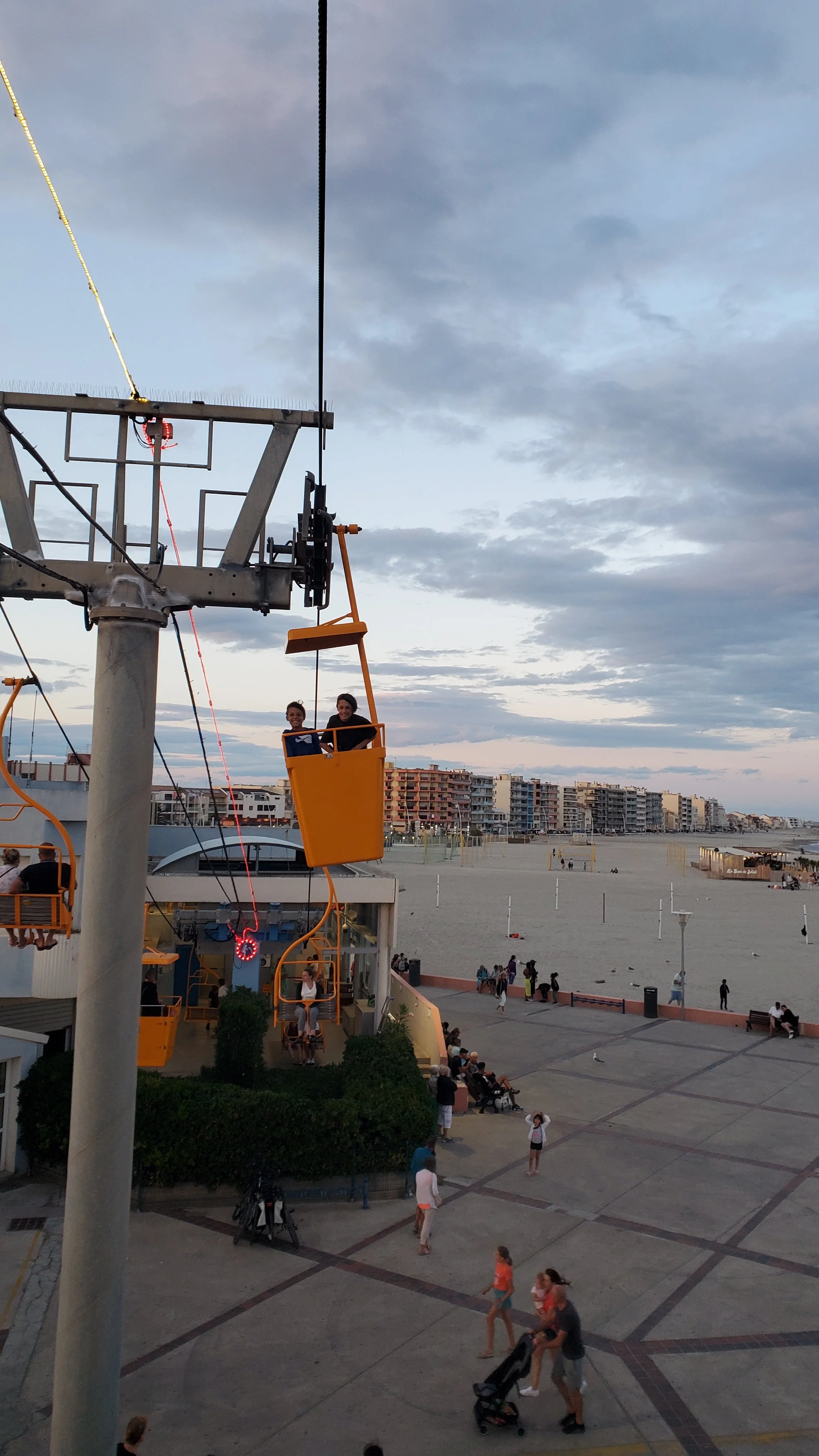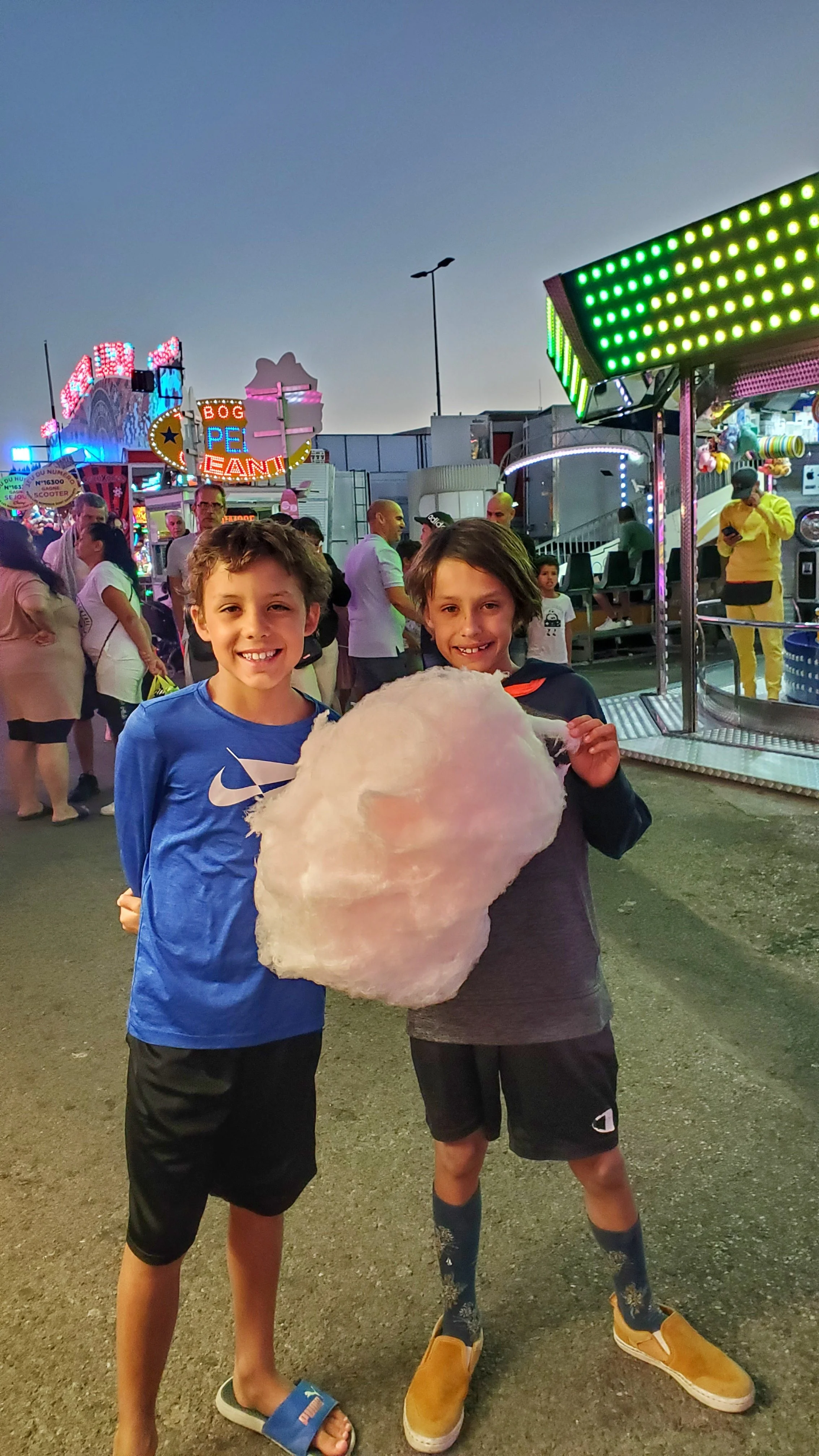 After another perfect beach day, we cleaned up, had a relaxed dinner at our Airbnb, and headed out for the evening. Our first stop was Luna Park de Palavas, a lively summer carnival glowing with lights and energy. The boys rode rides, devoured cotton candy, and had multiple rounds of bumper cars. Reid even braved his first roller coaster—he mostly loved it.