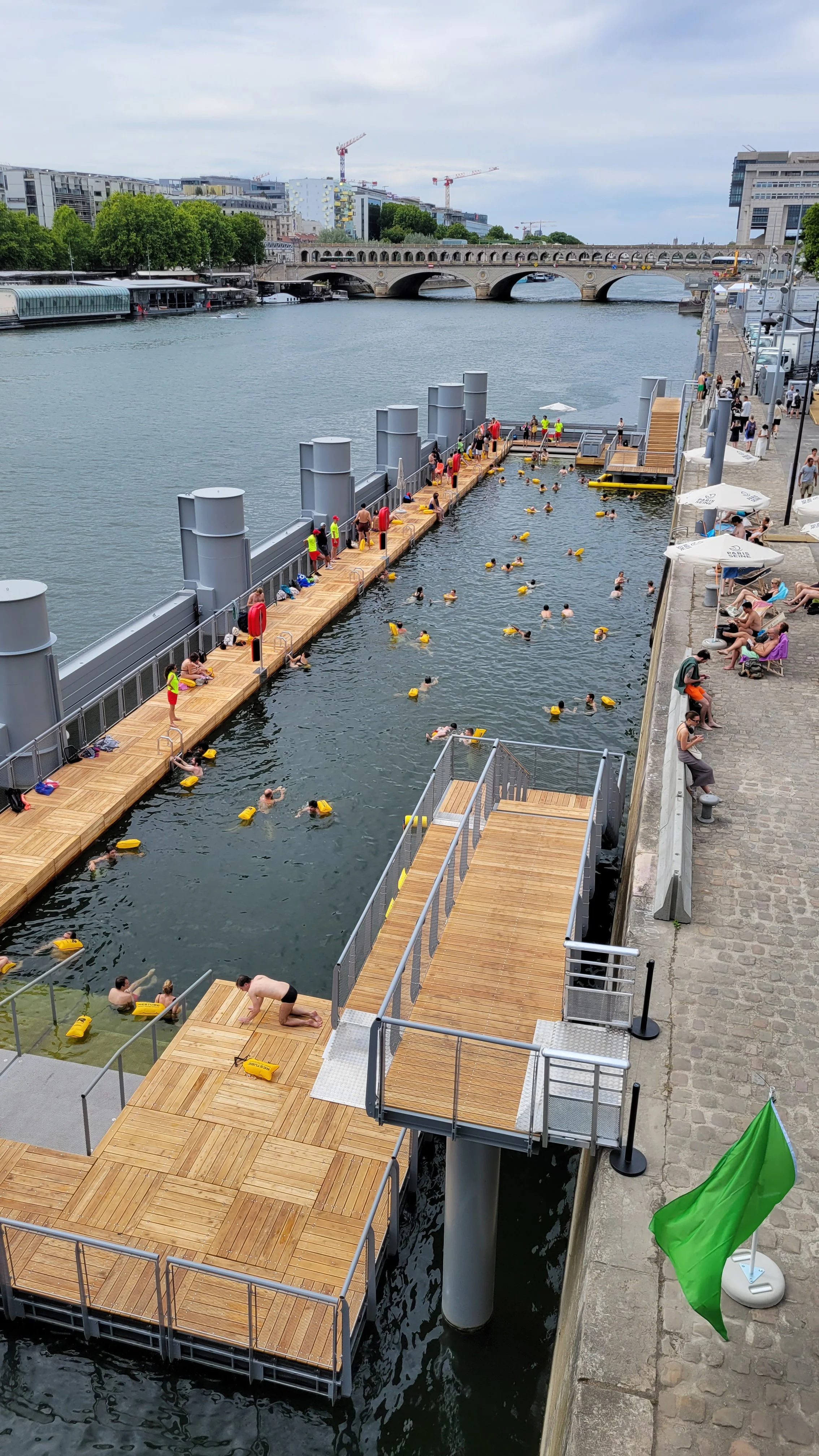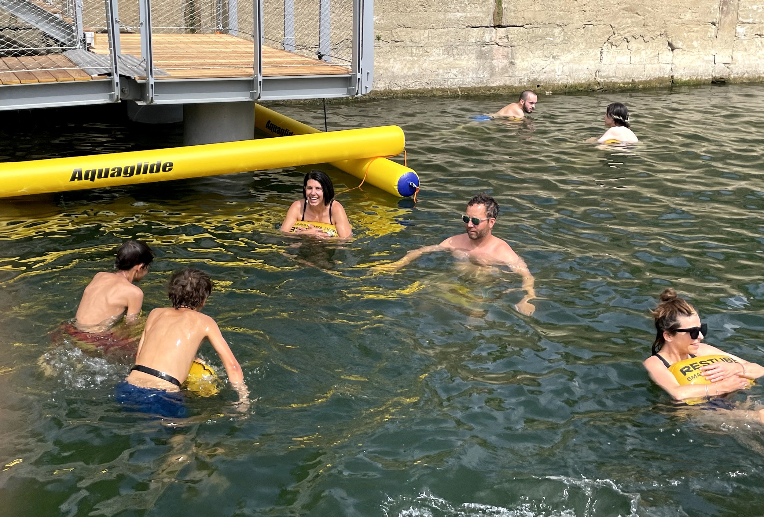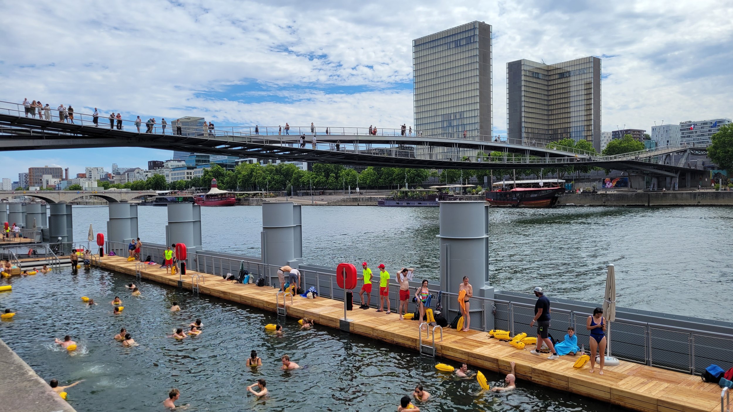 After a bit of searching, we found one of the open swim locations—a sectioned-off area along the river where fresh Seine water flowed through an enclosed space. Floaties were required (and gladly accepted), and with a bit of spontaneity (and some missing swimsuits), we jumped in.