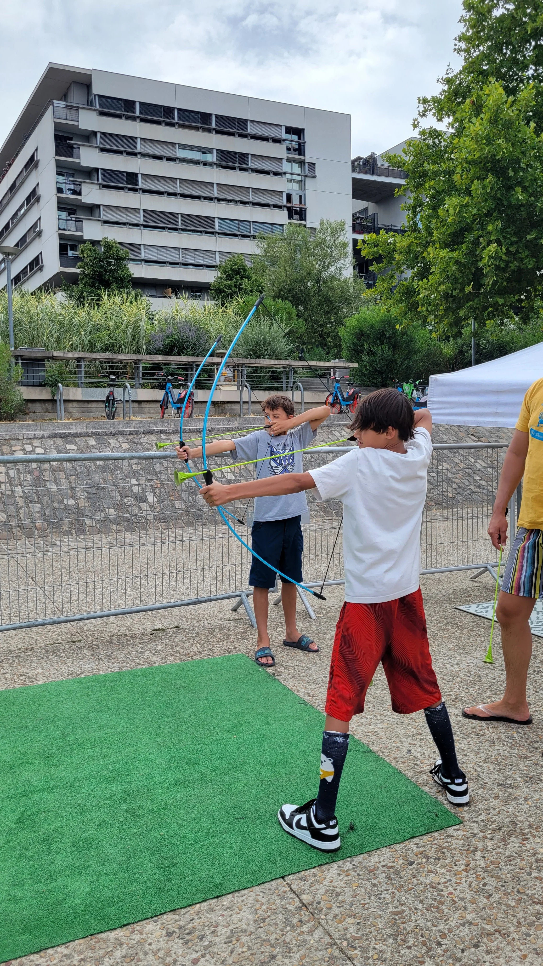After drying off, we crossed the river and stumbled upon something completely unplanned—a neighborhood family event filled with games and activities. There was archery, trampolines, and all kinds of fun for the kids.