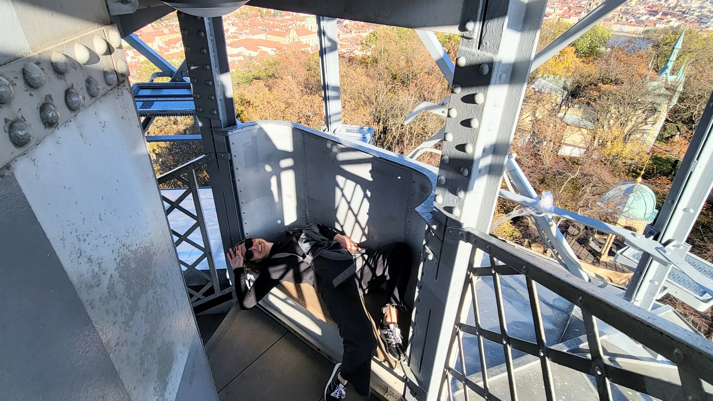 Fueled by pasta and citrusy joy, we climbed even higher up the winding streets to Petřín Tower, an iconic steel lookout tower inspired by Paris’ Eiffel Tower. In the fall, it’s especially beautiful—sweeping views of Prague’s red terracotta rooftops and tree-lined hills. Tickets were around $12 per person, and the 299 stairs to the top were…dizzying. But the views? Completely worth the spinning head.