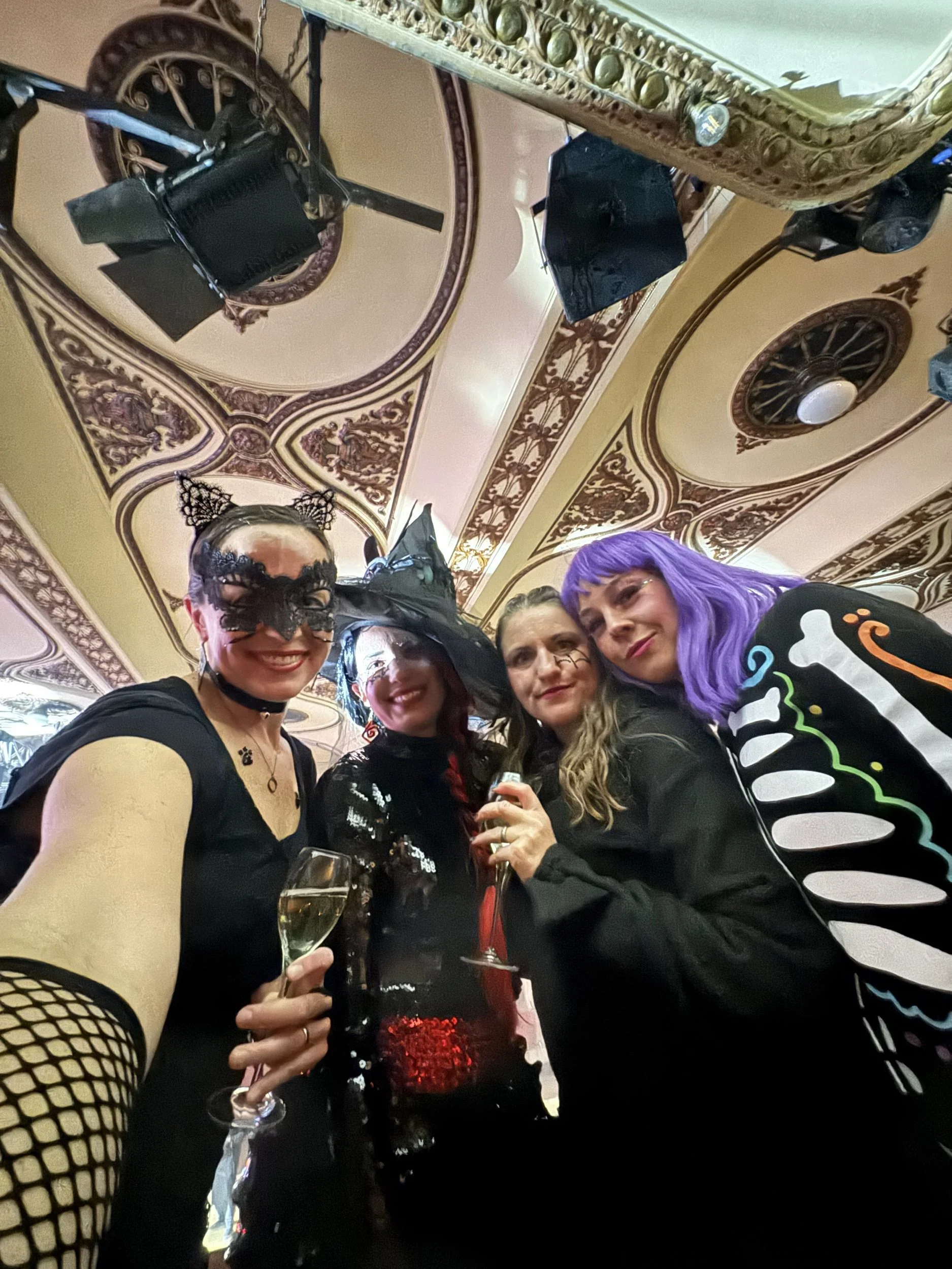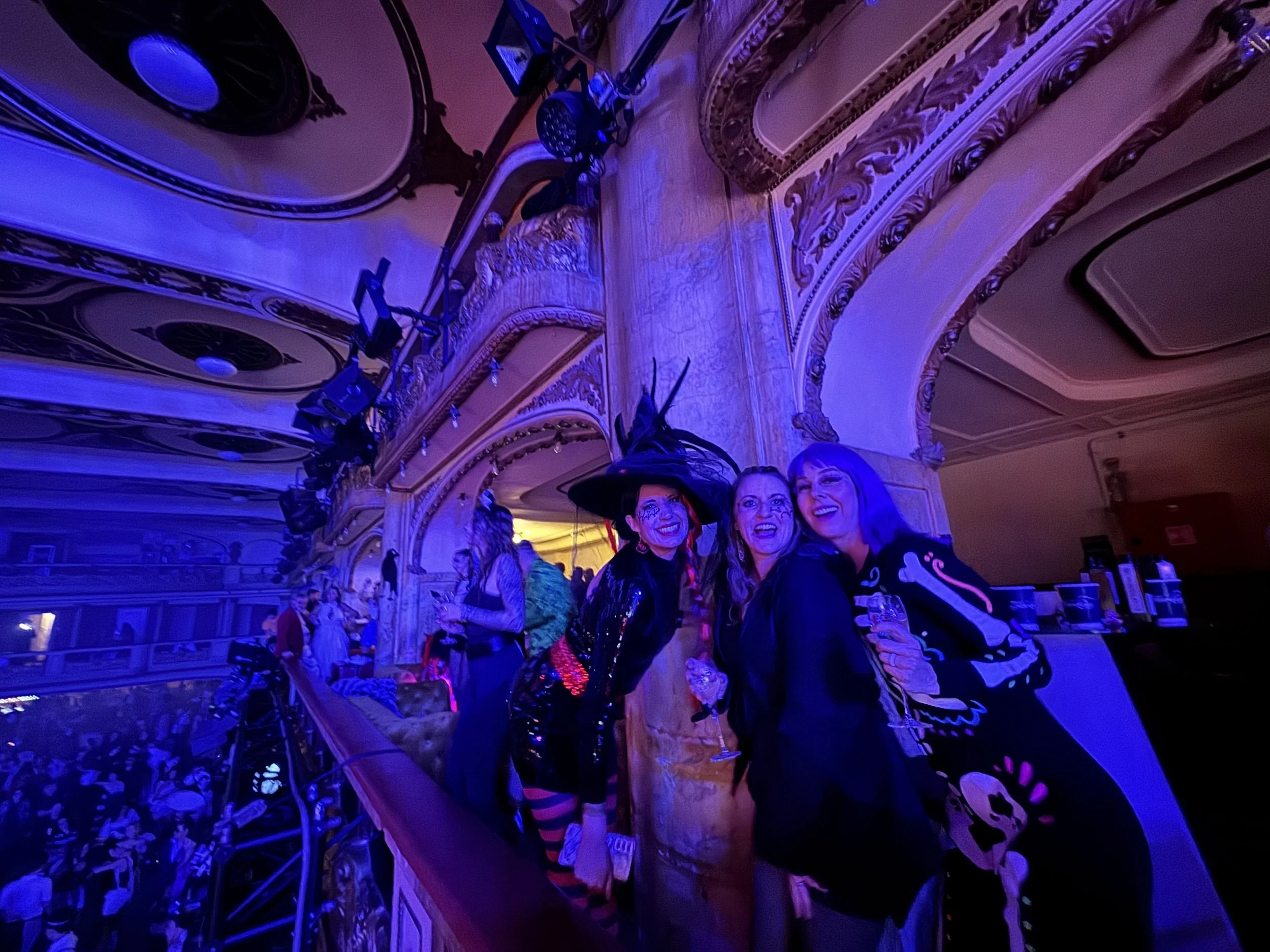 Lucerna Prague is already an iconic venue—but on Halloween, it becomes something else entirely. We arrived at the Great Hall, checked in, and somehow found ourselves on the VIP list. No idea how it happened. We did not ask questions. We were escorted to an exclusive VIP area, handed bottles of Prosecco, and given a balcony view overlooking the stage and dance floor below. The space itself was jaw-dropping: a grand hall with three levels of balconies, ornate ceiling details, and old-world glamour that made us feel like we’d stepped into a movie. We honestly couldn’t believe this was our Halloween night. The costumes around us were next-level—gory horror looks, elaborate harlequins, dramatic makeup, and everything in between. After a couple bottles of Prosecco, we wandered to the other side of the ballroom, where I finally lived out a lifelong dream and did one of those 360-degree video camera moments. We shelled out all our korunas and have zero regrets. (See video. It’s everything.)