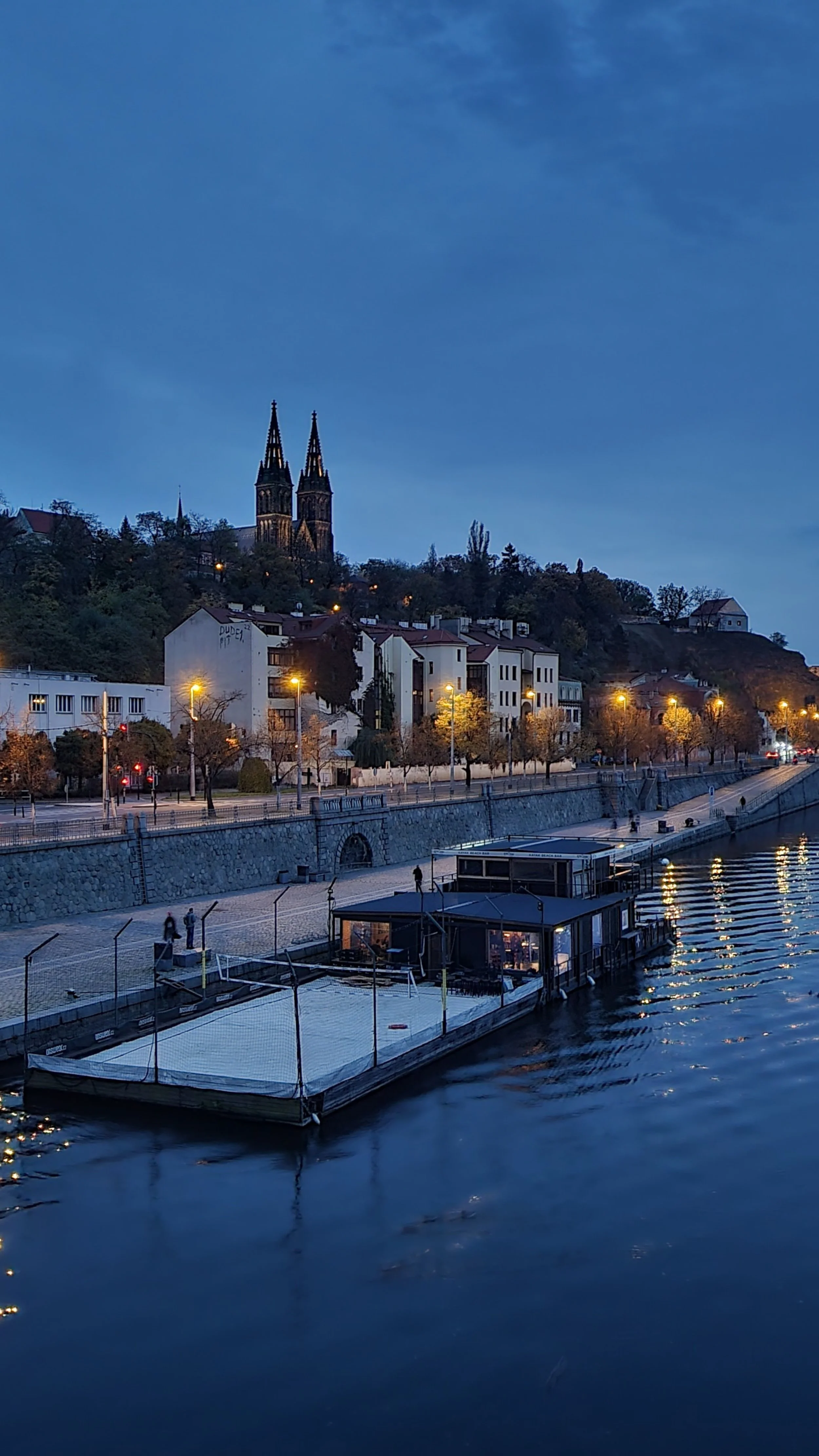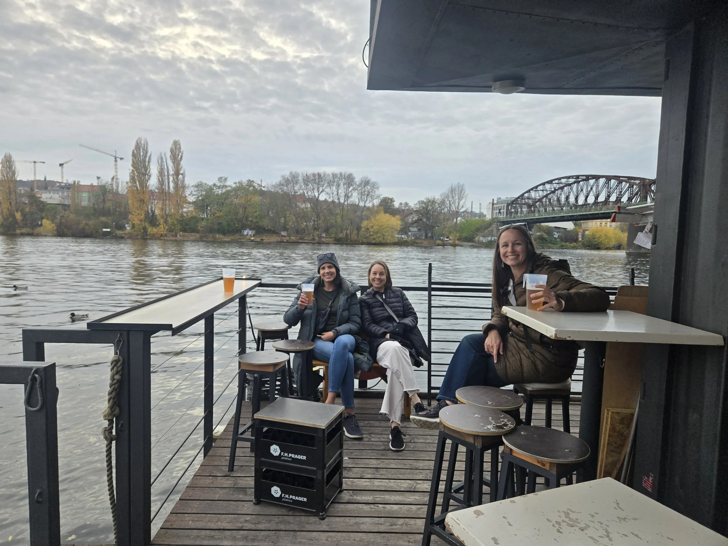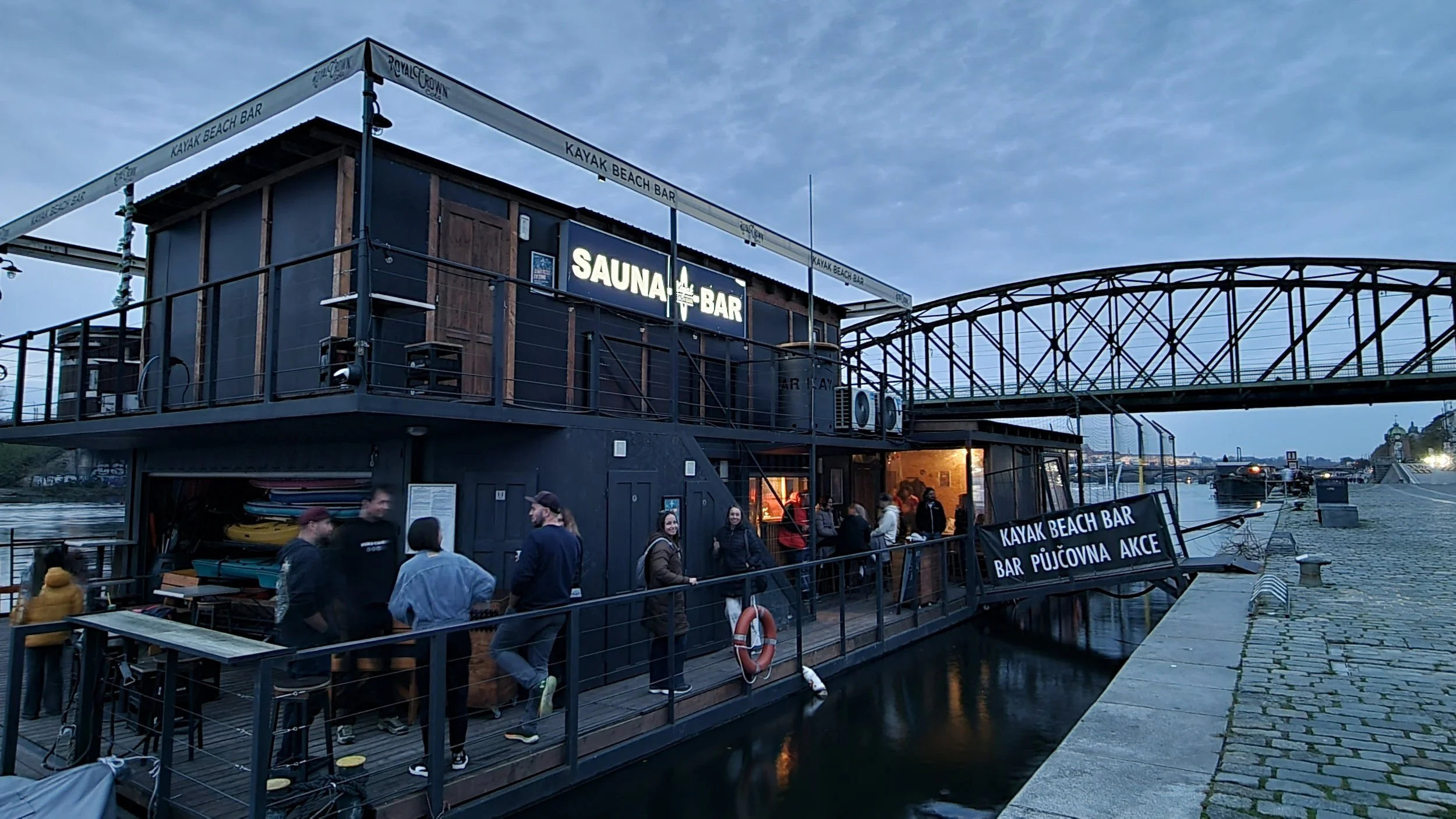 We continued wandering along the Vltava as the sun dipped lower, turning the water golden, when we stumbled upon a floating bar called Kayak Bar. In the summer, this spot transforms into a full-on river hangout—kayak rentals, saunas and hot tubs, a sandy “beach” for volleyball, and a laid-back vibe that feels more Mediterranean than Central European.