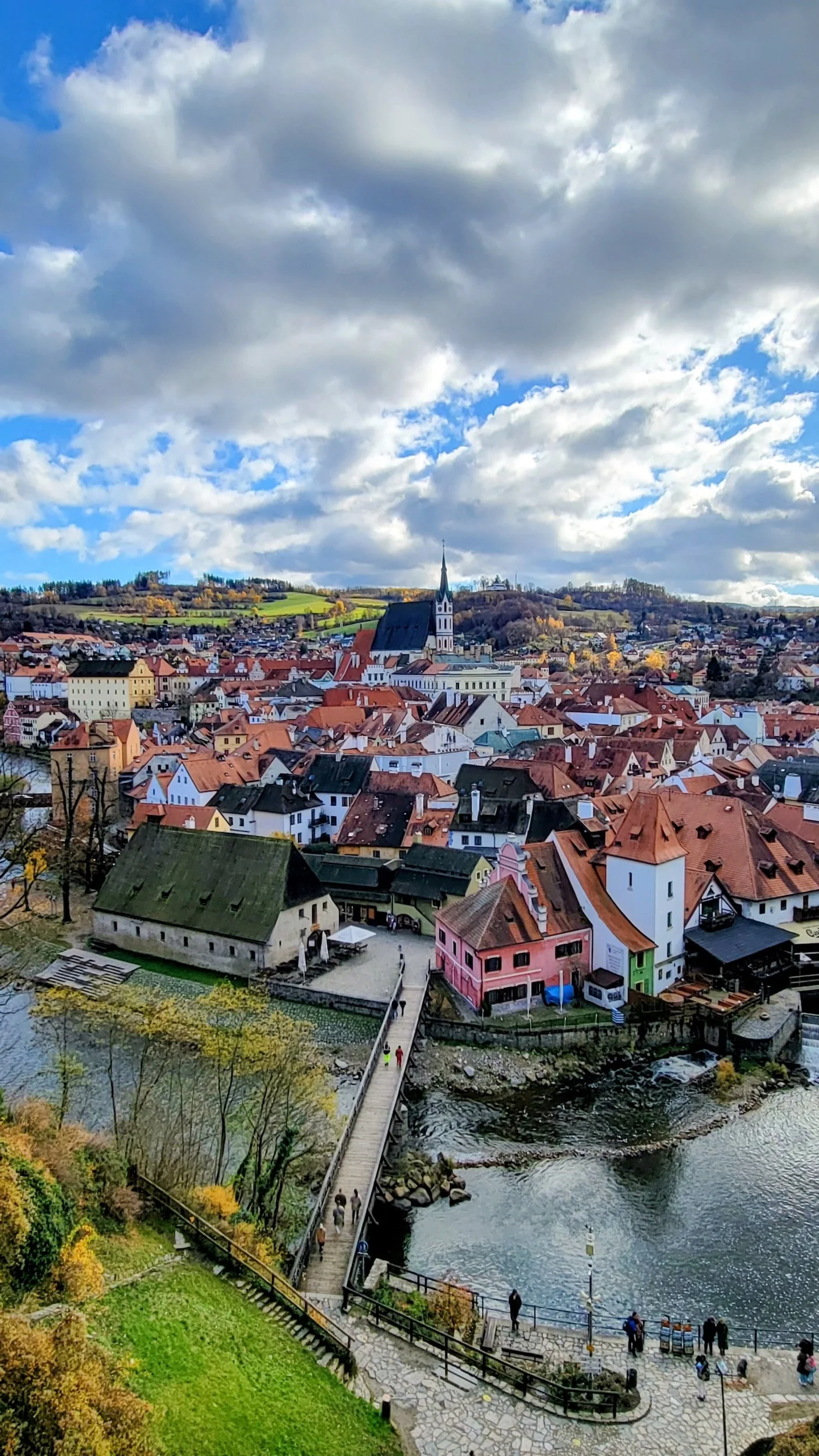 Eventually, we made our way to the lower viewing of Cloak Bridge (Plášťový most)—one of Český Krumlov’s most striking landmarks. This massive, multi-level stone bridge connects the castle to its theater and gardens, soaring high above the town below.