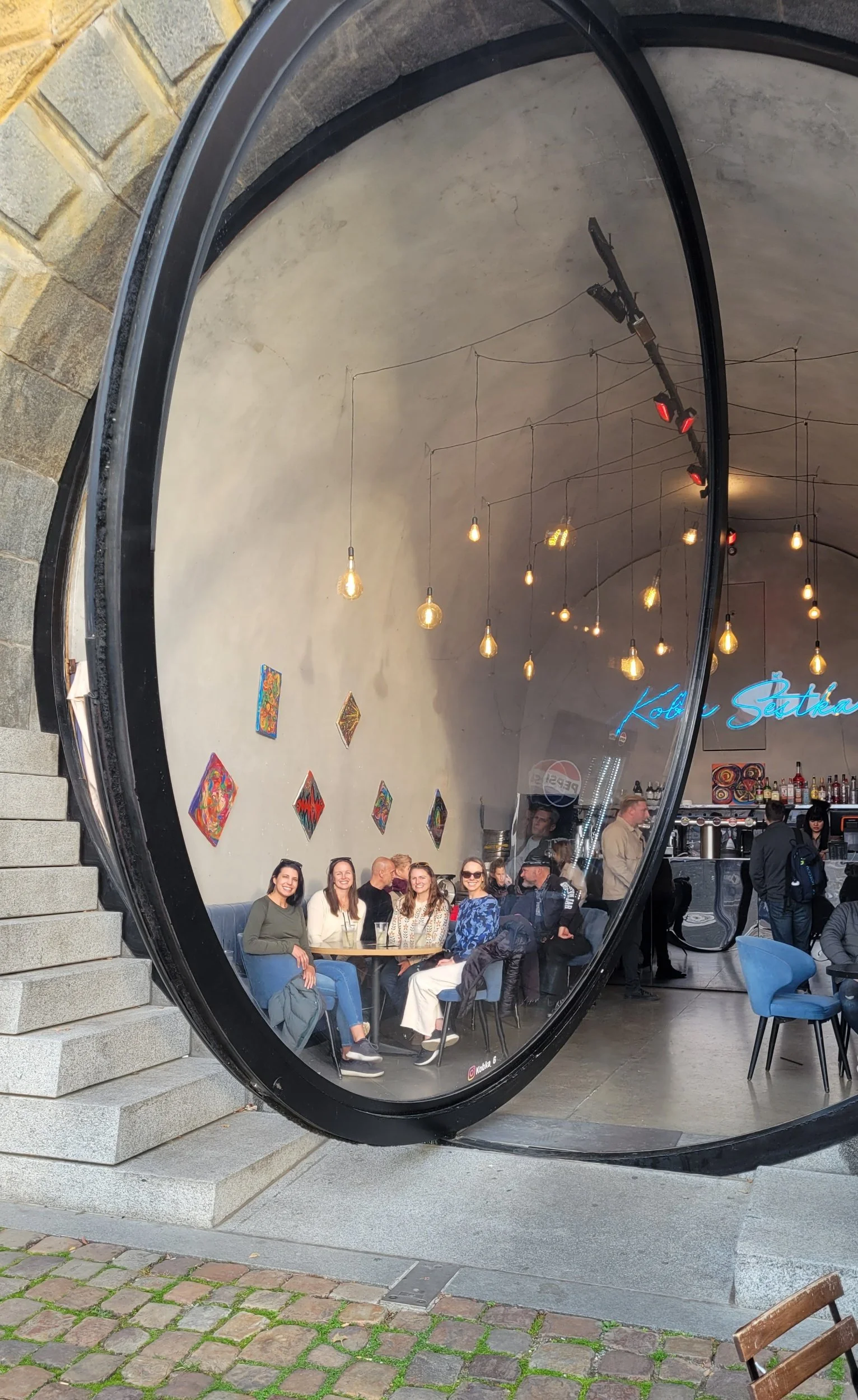 We stopped at Kobka Bar, one of the several riverfront spaces that were originally built in the 19th century as storage vaults, tucked into the stone embankment walls along the river. Today, they’ve been transformed into some of the coolest cafés, galleries, and bars in Prague.