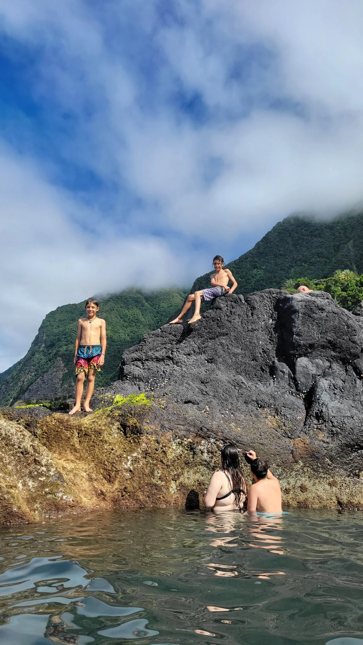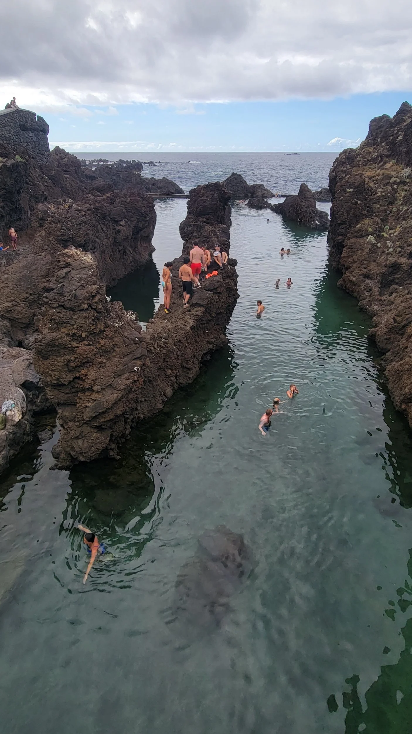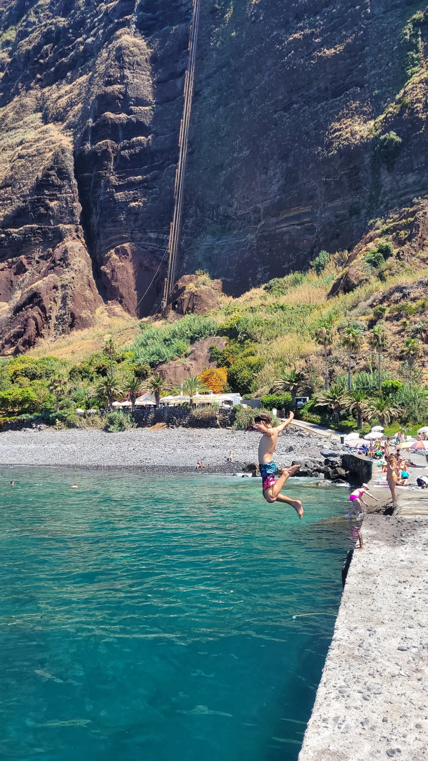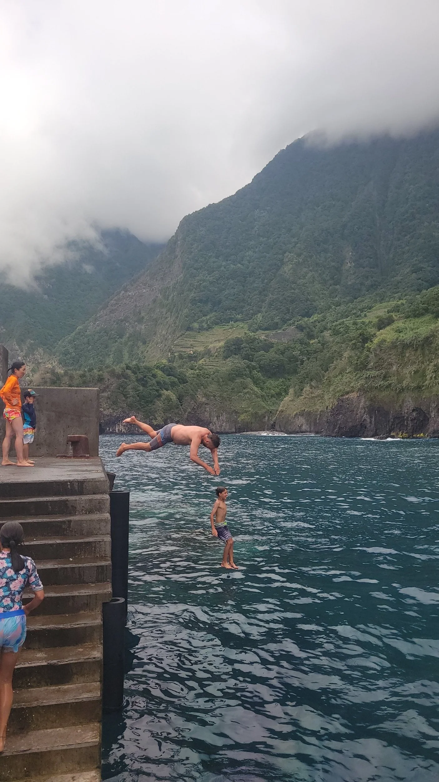 At the bottom sits Fajã dos Padres — a secluded coastal fajã accessible only by boat or cable car. For centuries it has been home to a small agricultural community, and today it still functions as a working organic plantation. We wandered through rows of banana trees, mango, avocado, papaya, and passionfruit growing in rich volcanic soil. The cliffs towered behind us, trapping the heat and creating a warm subtropical microclimate. But it was hot. So naturally, we made a beeline for the water. The beach is rocky, so we headed for the pier and started flinging ourselves into the sea — flips, spins, and dives. The water was shockingly refreshing and impossibly blue.