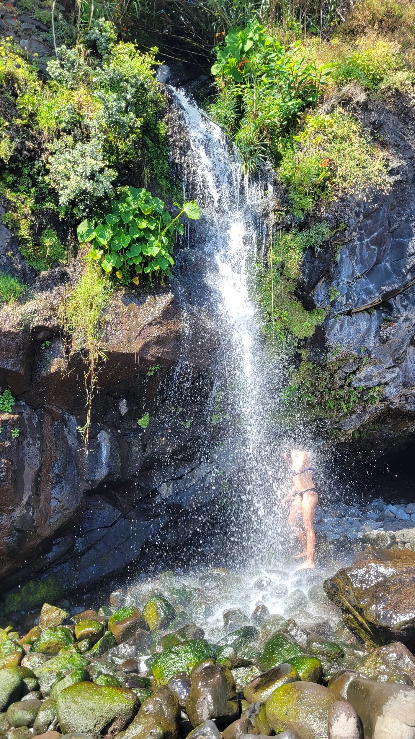 Naturally, we wasted no time. Swimsuits on. Down, down, down we went — Seixal is no joke when it comes to steep streets — and in under ten minutes we were standing on that black sand beach. And once again, we were stunned.