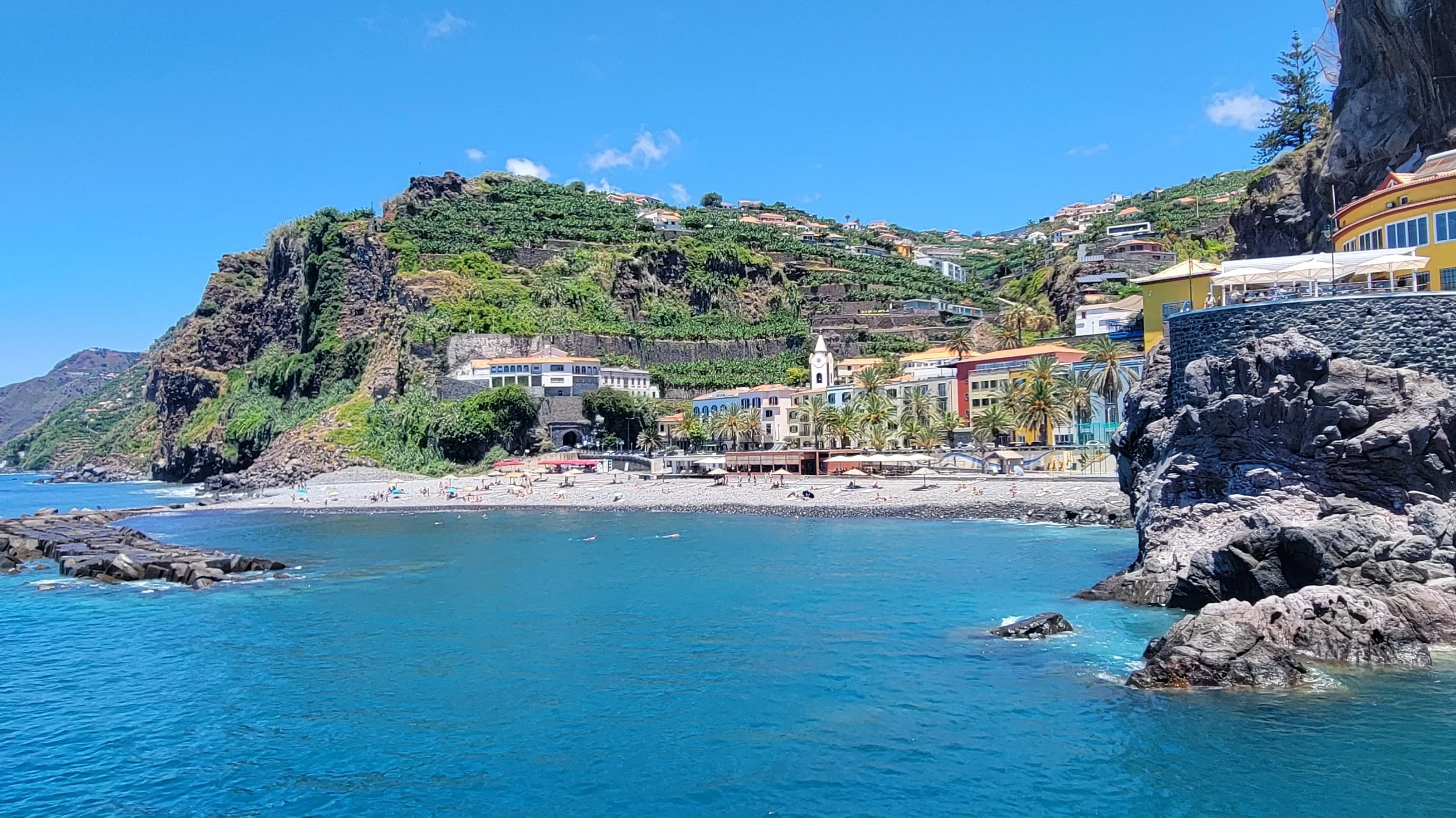 Ponta do Sol sits along Madeira’s southwest coast and is known as one of the sunniest spots on the island — its name literally means “Point of the Sun.” Colorful homes climb the hillsides above a small pebble beach, while a graceful stone pier stretches into the Atlantic. Palm trees line the waterfront promenade, and the cliffs rising behind the town make the whole scene feel both dramatic and peaceful at the same time. As we wandered along the waterfront, Chip and I both agreed: this would be a beautiful place to live.