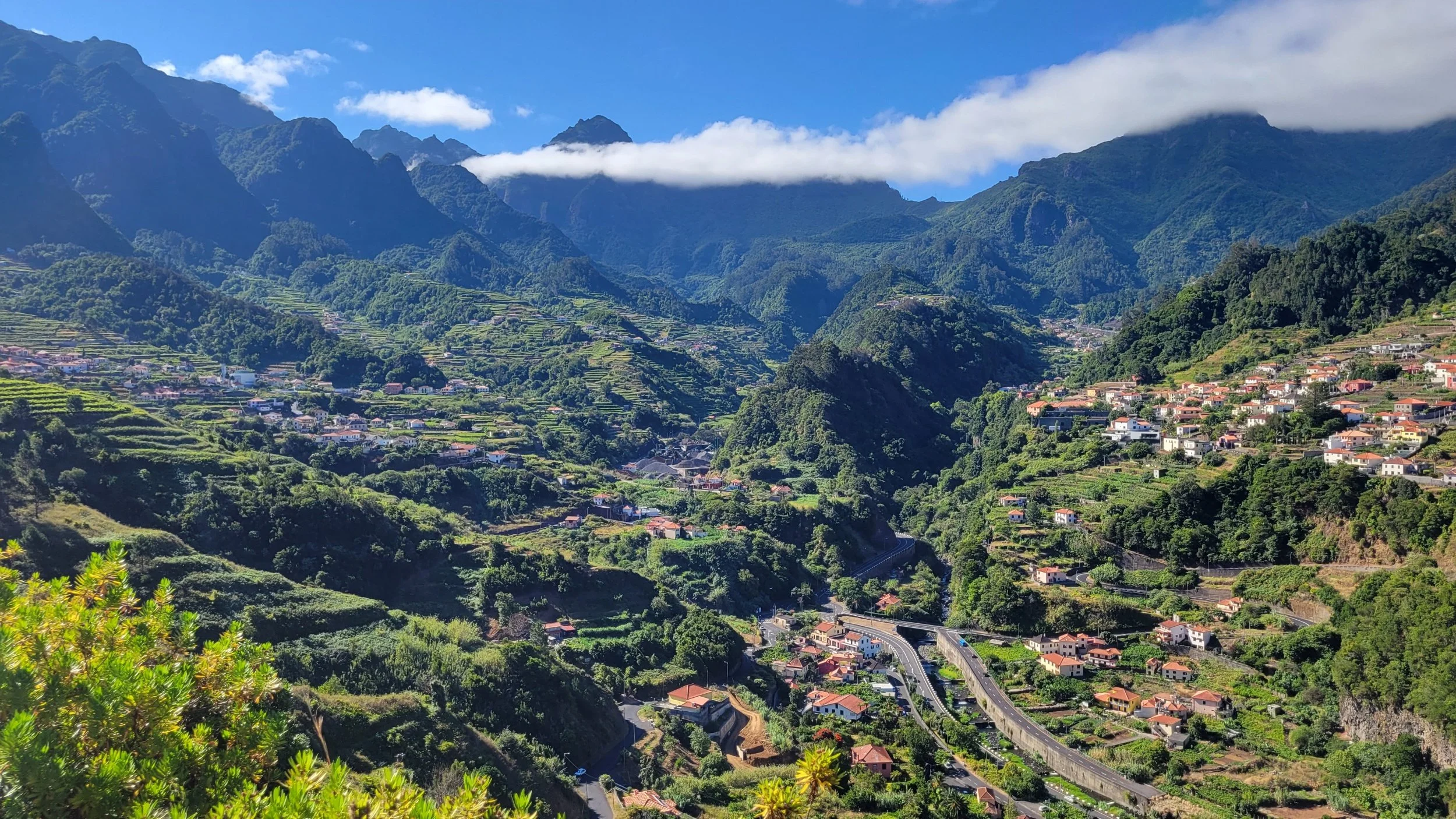 Below us lay São Vicente, its red-tiled roofs scattered through a vibrant green valley. Terraced hillsides climbed toward jagged mountain peaks. A low band of clouds stretched across the ridgeline like a perfectly placed brushstroke. The morning light illuminated every fold of the mountains, revealing dense forests, farmland, and winding roads that curved through the valley like ribbons. I could have stood there all day.